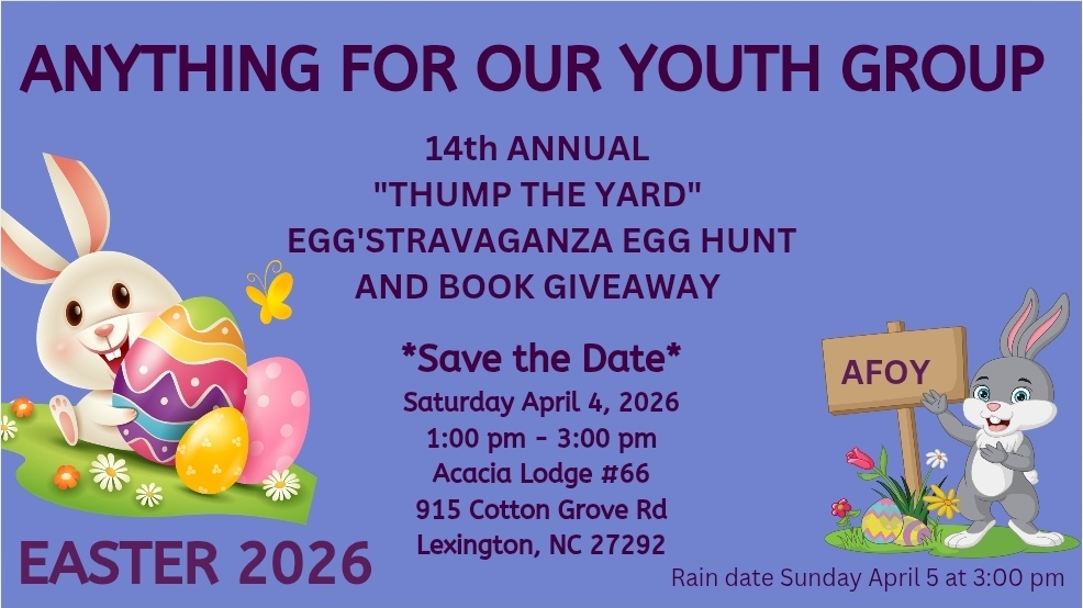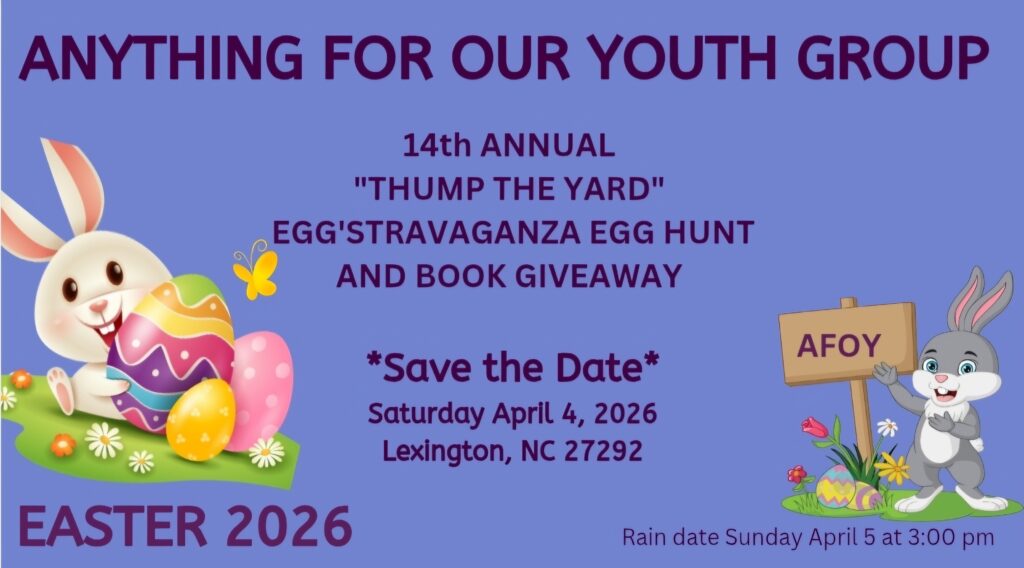 ANYTHING FOR OUR YOUTH GROUP INC. WILL HOST THE 14th ANNUAL “THUMP THE YARD” EGG’STRAVAGANZA EGG HUNT AND BOOK GIVE AWAY FOR KIDS OF ALL AGES, A FUN FAMILY EVENT.