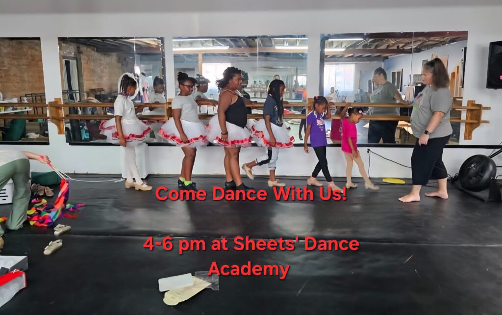 Come dance with us at Sheets’ Dance Academy every Wednesday at 4 – 6:15 pm, located at 111 S Main St, Lexington, NC 27292 (enter through the back alley with the green sign in the door)